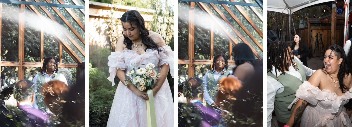 Just a few days before I was having gender-affirming surgery, we decided to take the leap and join the Big Queer Wedding. It felt like the cards fell into place…suddenly the chance to get married in a way that felt authentic to us appeared on a golden platter. We wouldn’t have had pure joy without this opportunity. I wouldn’t have gotten to share my truest vows, wearing what I’ve always wanted at the altar, watching the love of my life walk through that doorway in the most magical, fantastical, perfect dress of all time. Now, more than ever, queer joy matters most. And so we’re pursuing our joy in spite of it all. Having such an incredible rally of community and family around us, made it all possible. It is truly my happiest day ever.”